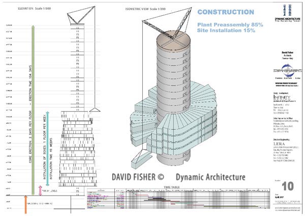 Fischer menginginkan desain ruang dimana Anda bisa menikmati matahari terbit dan tebenam dari ruang yang sama. Putarannya akan memakan waktu 3 jam dan ditenagai oleh panel-panel surya dan 79 turbin angin, dengan satu turbin yang ditempatkan di antara tiap lantai. Hampir seluruh strukturnya dibuat secara off-site. (Sumber)